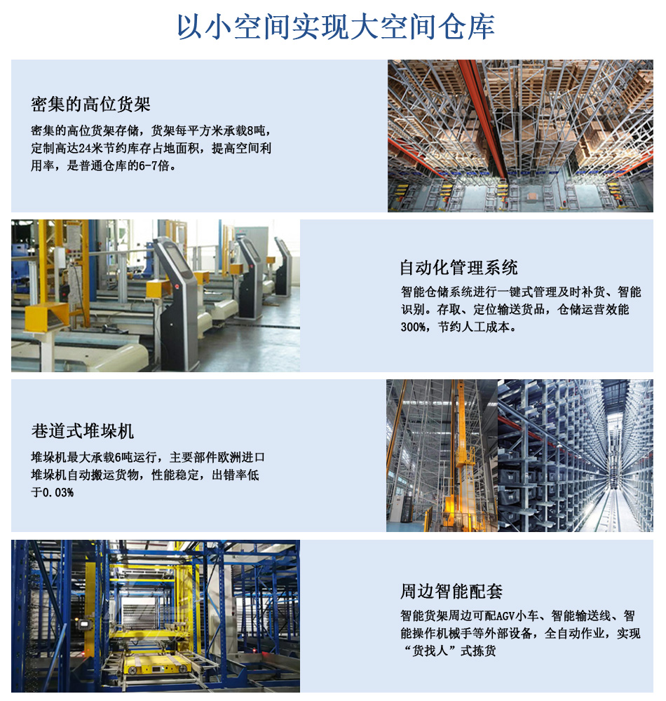 可用于各类高密度储存方式的仓库。 可以通过编程实现取货、运送、放置等任务,并可与上位机或WMS系统进 行通讯,结合RFID、条码识别技术,实现自动化识别、存取、盘库等功能。